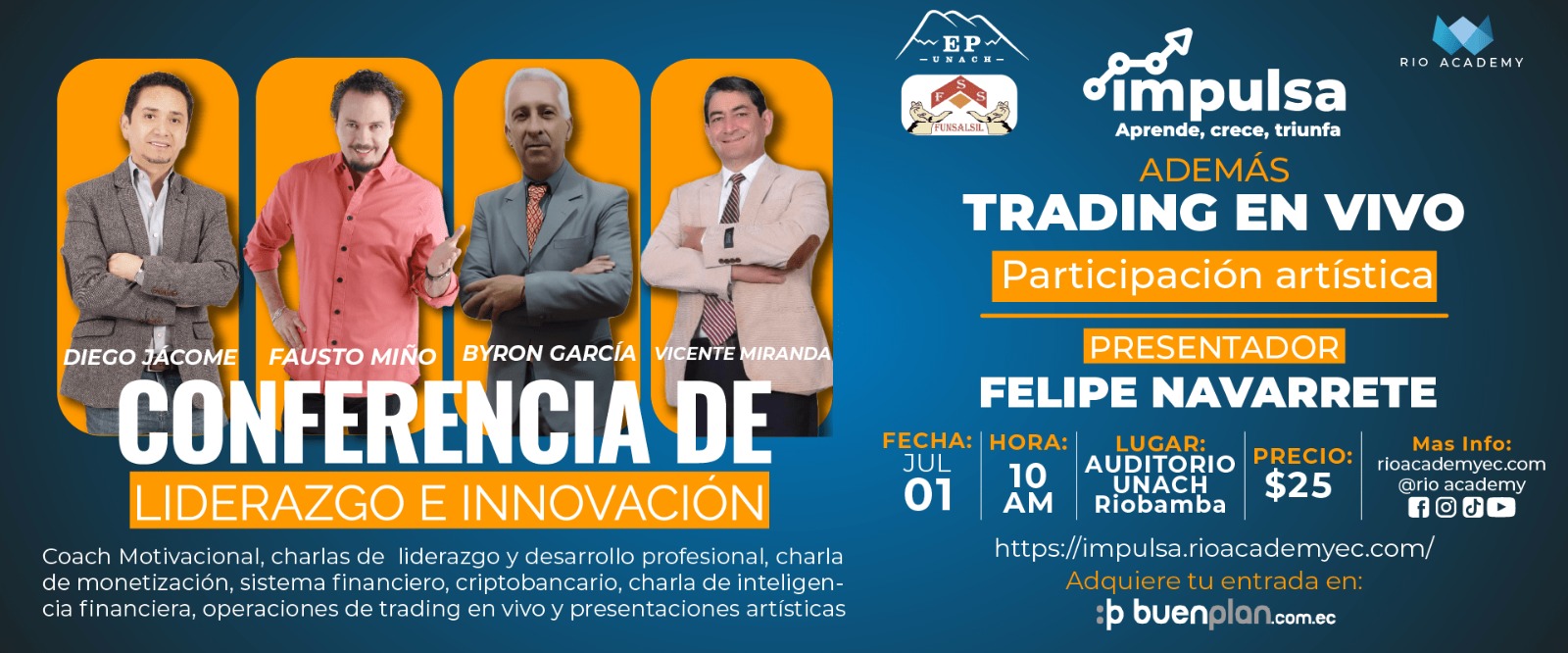 Preparamos un evento para aquellos que buscan triunfar en el mundo empresarial. Reuniendo a líderes inspiradores, expertos en liderazgo y visionarios innovadores, esta conferencia ofrece conocimientos y herramientas prácticas para impulsar el éxito de las empresas. A través de charlas motivadoras y sesiones interactivas, los asistentes se sumergen en un ambiente estimulante que les permite liderar con visión, inspirar a sus equipos y fomentar la innovación en sus organizaciones. Esta conferencia proporciona inspiración y nuevas ideas para alcanzar el éxito en un entorno empresarial altamente competitivo. No pierdas la oportunidad de participar en este evento transformador y llevar tu carrera y negocio al siguiente nivel.